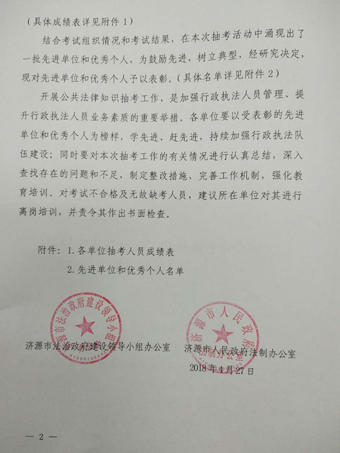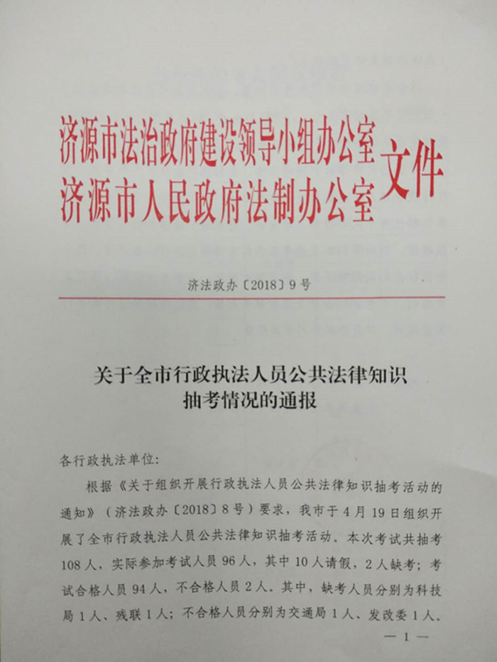 济法政办〔2018〕9号 关于全市行政执法人员公共法律知识抽考情况的通报